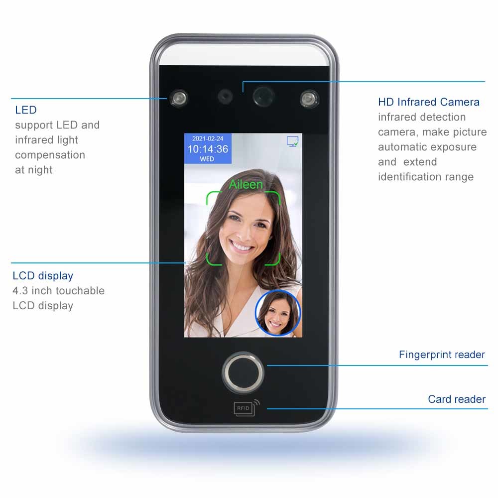 Layar sentuh IPS HD 5 inci, resolusi layar: 1280*720.Pengenalan wajah dinamis, kartu rfid / kartu ic adalah opsional, kata sandi dukungan, wajah sebagai identifikasi.