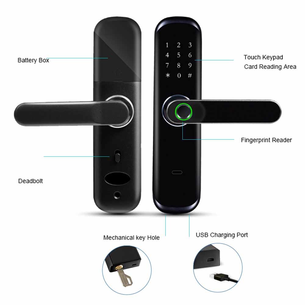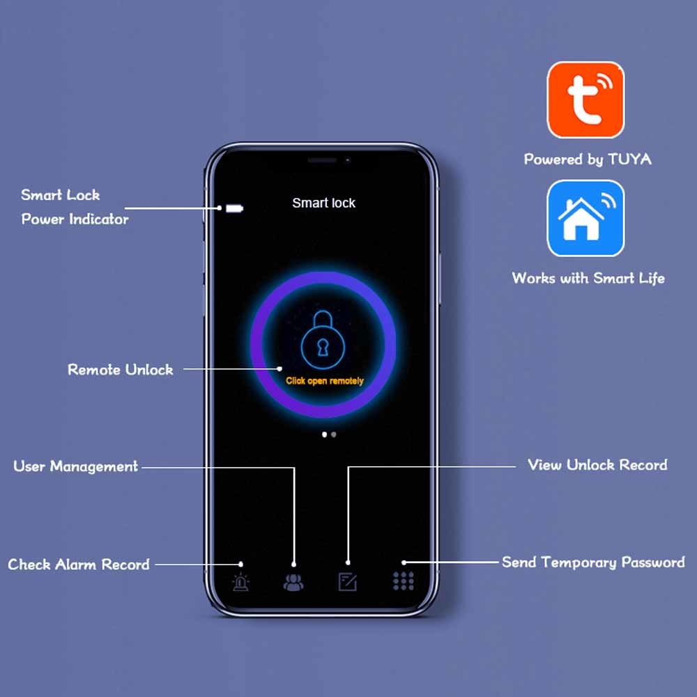 Ini memiliki sistem pengelolaan yang nyaman dan 6 cara untuk membuka kunci: Buka Kunci Sidik Jari, Buka Kunci APLIKASI BLE, Buka Kunci WiFi Jarak Jauh,Kata Sandi/PIN Buka Kunci, Buka Kunci Kartudan Kunci Mekanik Buka Kunci. Ini akan memenuhi semua kebutuhan Anda tentang kunci pintar. Dengan manajemen APLIKASI canggih, melalui WiFi atau BLE untuk menghubungkan kunci pintar ke ponsel cerdas Anda, dan Anda dapat mengelola kunci pintu pintar Anda di mana saja dan kapan saja.